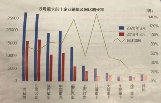 8月,在重卡市場高速增長的帶動下,排名前十的重卡企業(yè)均實(shí)現(xiàn)了同比增長。