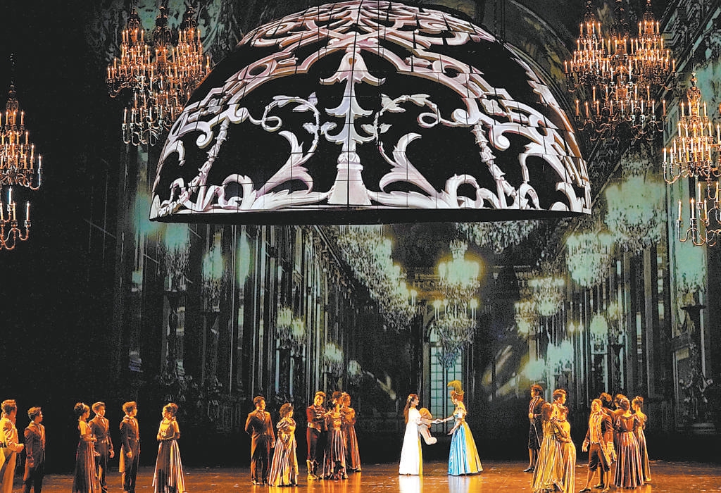 與壯闊宏大的作品立意相匹配的,是當(dāng)?shù)闷鹑A美二字的舞臺呈現(xiàn)。璀璨的吊燈、長長的樓梯等鮮明意象不斷出現(xiàn),簡潔的布景與流動的影像虛實交織,把輝煌的宮廷、幽靜的鄉(xiāng)村、無垠的星空等場景營造得深邃動人。其中,由多塊LED屏拼成的圓弧最引人注目,在舞美設(shè)計維亞切斯拉夫·奧庫涅夫的解讀中,和平的寧靜短暫降臨時,圓弧可以隨影像變幻為宮殿穹頂、簡潔的花園涼亭,為生活遮風(fēng)擋雨;戰(zhàn)爭襲來,刺目的紅光從破裂崩碎的圓弧中迸濺而出,恰如滿目瘡痍、生靈涂炭的現(xiàn)實。最終,幾瓣圓弧拼成碧水青山的“地球”,呼應(yīng)原著小說標(biāo)題中的俄語單詞“Mip”,即“世界”,將作品的意境再次推上新的高點。