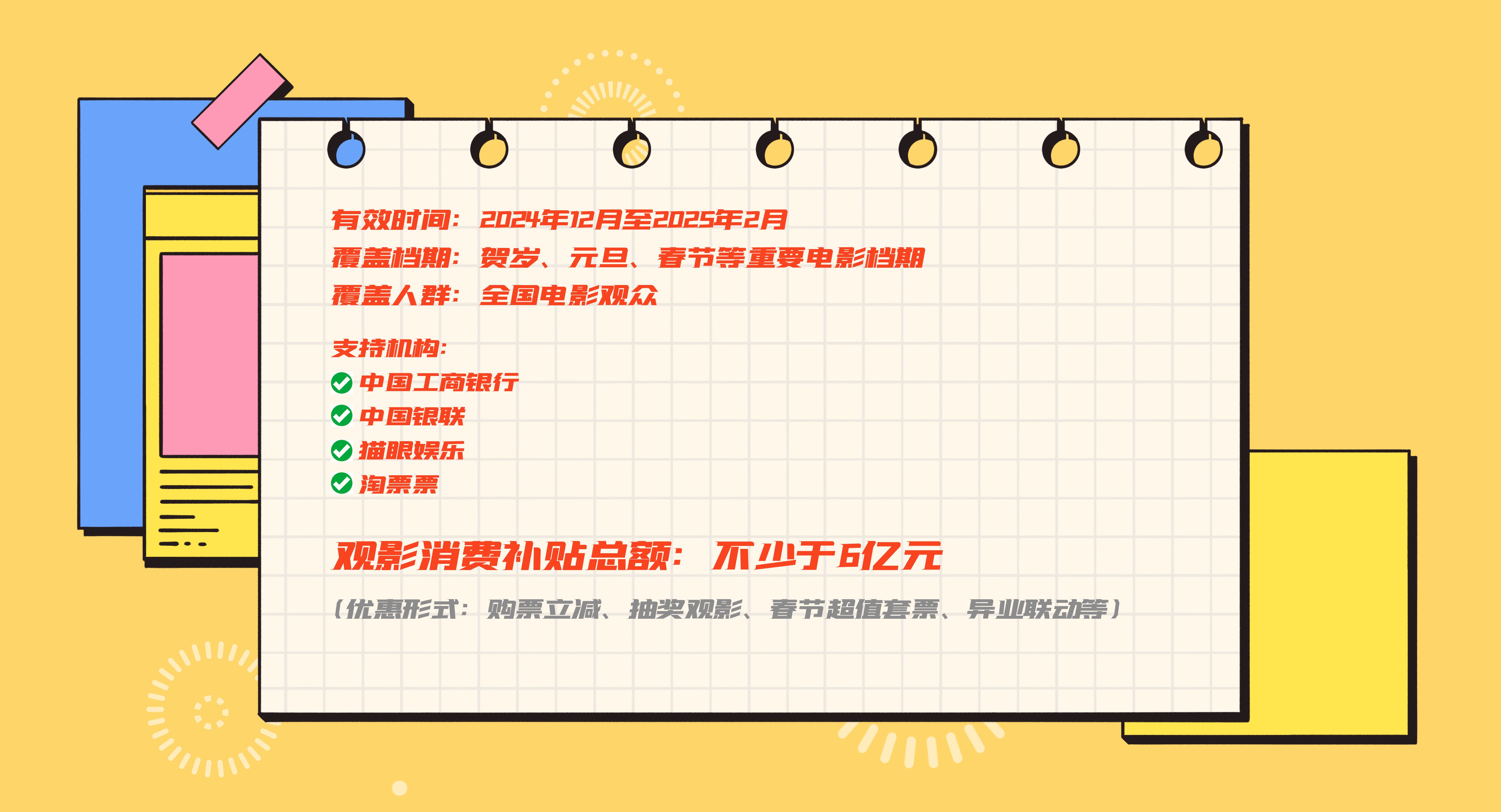 2024年12月9日至2025年2月28日,用戶可通過淘票票App、微信淘票票小程序、支付寶淘票票小程序、淘寶淘票票小程序首頁“全國電影惠民消費(fèi)季”或“政府補(bǔ)貼”進(jìn)入活動專題頁領(lǐng)取5—50元紅包,并且同時可享受淘票票買一贈一、淘麥VIP積分禮包、88VIP全年觀影優(yōu)惠券、影迷月活動。