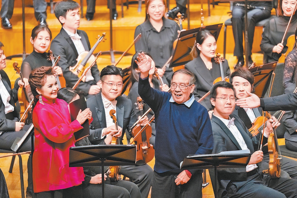 音樂(lè)會(huì)尾聲,作曲家鮑元愷(中)登臺(tái)向觀眾揮手致意。