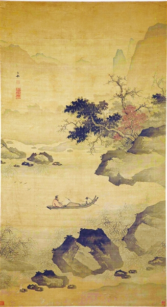 天博館藏明代蔣嵩的《秋江歸棹圖》軸,畫中遠(yuǎn)山如黛,江面微微泛波,一葉小舟悠然浮在水面。船夫回頭張望,船尾一老者閑適地看書,任憑小舟在水中飄蕩。岸上有山石樹木,水邊有蘆葦叢叢,一派秋季的醉人風(fēng)光。天博書畫研究部的李晶介紹:“畫面層次感很強(qiáng),布局優(yōu)美,遠(yuǎn)山近水、山石、樹木、蘆葦搭配得相得益彰。內(nèi)容豐富,意境簡淡,水墨厚重。山石兼皴帶染,筆墨滋潤?!?/p>