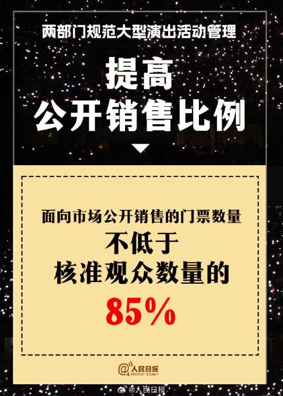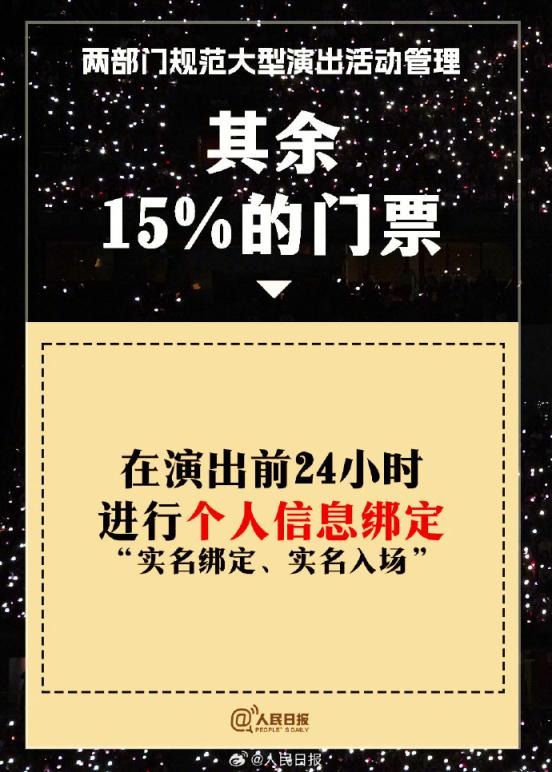 ?兩部門通知:①實名購票、實名入場。5000人以上演唱會購票人和入場人必須一致;②大型演出要設(shè)定梯次退票標(biāo)準(zhǔn);③公開銷售門票不低于核準(zhǔn)觀眾數(shù)量的85%;④嚴(yán)禁假唱、假演奏。更多↓↓↓詳戳,周知!