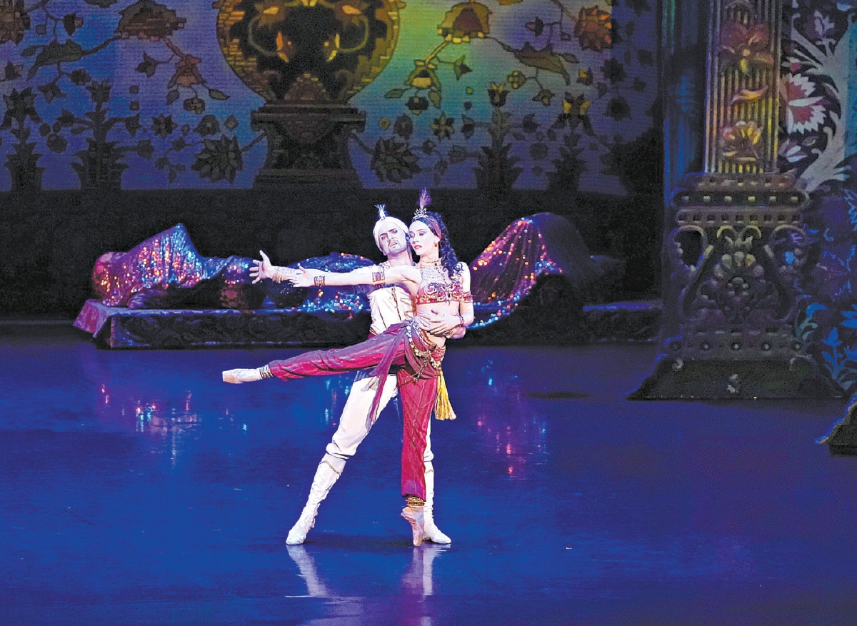 故事在富麗堂皇的宮殿中開啟,典雅繁復(fù)的梁柱、燦如繁星的燈盞幽邃美麗,夢幻得令人驚嘆。連續(xù)3天,兩位首席舞者安娜·薩莫斯特列洛娃、伊琳娜·薩波日尼科娃與第一獨舞拉達·薩爾塔科娃各自領(lǐng)銜的3組演員陣容輪番上場,舞動著這部作品的波折壯麗。同時,阿塞拜疆民族作曲家菲克列特·阿羅米夫為《一千零一夜》所作的配樂耐人尋味,他將東方旋律與歐洲古典形式交織,大量運用邦戈鼓、大鑼、木琴、顫音琴等打擊樂器,并加入了阿塞拜疆傳統(tǒng)弦樂器塔爾琴。在阿尤布·古利耶夫的帶領(lǐng)下,中央芭蕾舞團交響樂團的現(xiàn)場演奏極具戲劇張力和沖擊感,為整臺演出鋪陳了瑰麗磅礴的底色。