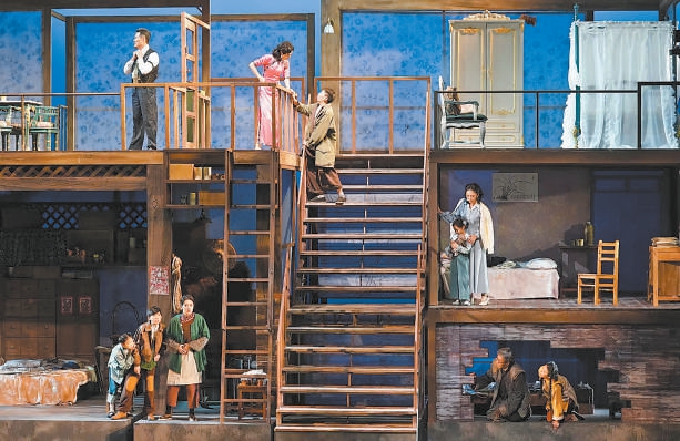 一座框架,幾個(gè)“格子間”,上海解放前夕的人間百態(tài),被裝進(jìn)舞臺上一方切面般的小天地里——75年前,電影《烏鴉與麻雀》巧妙圍繞石庫門一棟小公寓里形形色色的人們,對國民黨統(tǒng)治狀況進(jìn)行了入木三分的批判。經(jīng)典作品的力量歷久彌新,昨日,國家大劇院制作話劇《烏鴉與麻雀》迎來首演,在當(dāng)代戲劇舞臺上,老電影煥新醒來。