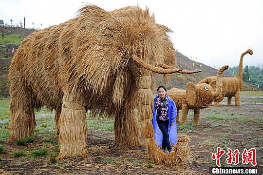 8月31日,一名游客與稻草猛犸合影。中新社記者 賀俊怡 攝