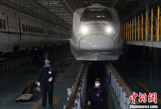 工作人員對動(dòng)車進(jìn)行檢修。 中新社記者 泱波 攝