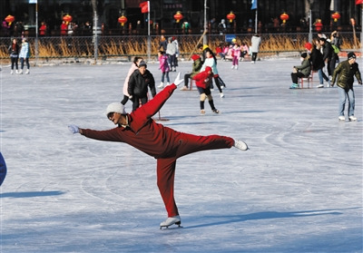在什剎海冰場(chǎng),數(shù)百名游客在用近1.7m高的柵欄圍起來(lái)的20多萬(wàn)平方米的滑冰區(qū)里滑冰。放眼望去,冰面上產(chǎn)生的冰屑像是鋪上了一層薄雪,與柵欄外圍的冰面形成了鮮明的對(duì)比。