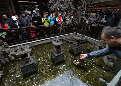中午時(shí)分,記者又一次仔細(xì)觀察了水池,在游人拋投硬幣時(shí),確實(shí)有一兩條金色的觀賞魚在石縫處游動(dòng)著。在木制欄桿四周,正貼著“禁止倚靠欄桿”、“禁止投幣”等字樣?!按汗?jié)游客爆滿,水池是從寬巷子到窄巷子的必經(jīng)之道,加上很多人在拋硬幣,頓時(shí)人滿為患。我們只好打印了幾張?zhí)嵝褟堎N起來?!鞭k公室工作人員還表示,“等春節(jié)游客潮稍微退卻,天氣回暖,我們就要派人下水打撈這些硬幣,用于景點(diǎn)建設(shè)。”