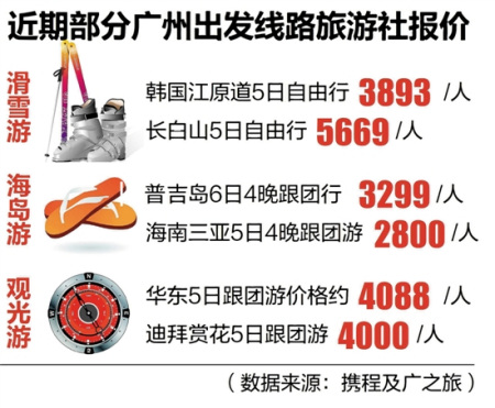 數(shù)據(jù)顯示,越來越多的出境游線路和國內(nèi)游價格相差無幾,不少線路更是“平到笑”。比如,羊城晚報記者根據(jù)攜程及廣之旅報價發(fā)現(xiàn),近期一些廣州出發(fā)到韓國滑雪自由行5日價格為3893元,而到長白山滑雪5日行的價格為5669元;廣州到三亞與到泰國普吉島海島游自由行價格均為3000元左右;廣州到迪拜5日賞花游跟團(tuán)游4000元,廣州到華東5日跟團(tuán)游4088元;廣州到越南、柬埔寨出境線路跟團(tuán)游普遍只需兩三千元,低過不少國內(nèi)游線路。