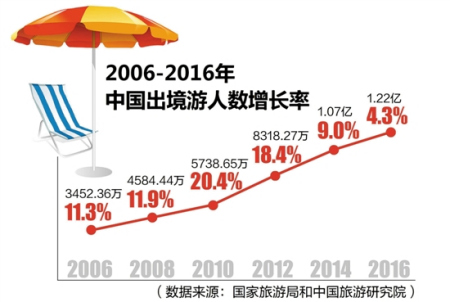 近年我國出境游增速,可以用“井噴”來形容。根據(jù)國家旅游局公布的2006年至2015年歷年《中國旅游業(yè)統(tǒng)計公報》以及中國旅游研究院和攜程聯(lián)合發(fā)布的《向中國游客致敬——2016年中國出境旅游者大數(shù)據(jù)》顯示,我國出境游人數(shù)已實現(xiàn)連續(xù)12年刷新歷史紀(jì)錄。出境游總?cè)藬?shù)從2006年的3452.36萬人次上升至2016年的1.22億人次,增加了2.5倍。2010年至2013年平均每年增幅接近20%。2014年至2016年增長放緩,分別為7%、7%和4.3%。預(yù)計未來5年,中國出境游客將超過6億人次。