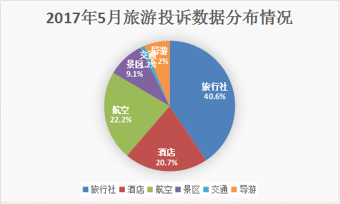 據(jù)平臺(tái)統(tǒng)計(jì),5月涉及旅行社投訴最多,占比為40.6%,其次為航空投訴(22.2%)、酒店投訴(20.7%)、景區(qū)投訴(9.1%),導(dǎo)游投訴(6.2%)和交通投訴各占(1.2%)。涉及旅行社的投訴主要提及了導(dǎo)游強(qiáng)制購物、商家無故取消訂單、不退款等問題。