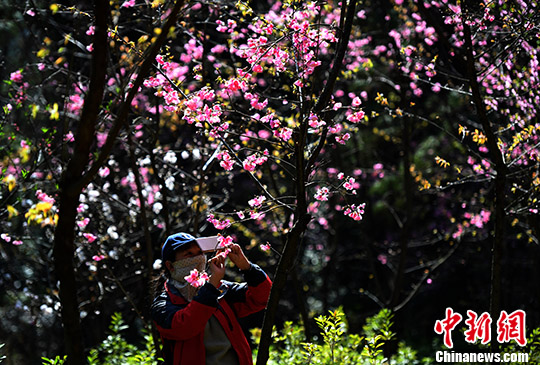 郊野公園里一位在用手機拍攝盛開桃花的市民。 中新社記者 李進紅 攝
