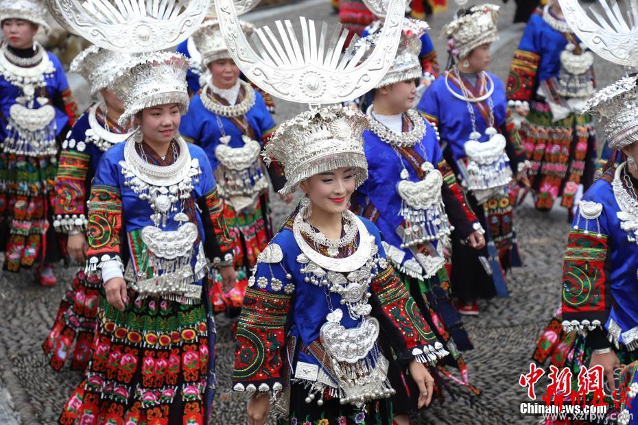 11月18日,苗族姑娘穿著盛裝參加巡游。當日,貴州省黔東南苗族侗族自治州雷山縣舉行2018苗年巡游活動,來自海內外的上萬名游客和當地苗族同胞一起歡聚,慶祝苗族新年。中新社記者 瞿宏倫 攝