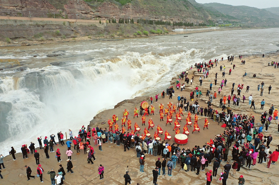 4月14日,游客在吉縣黃河壺口瀑布旅游區(qū)欣賞威風鑼鼓表演。春暖花開,隨著游客逐漸增多,吉縣黃河壺口瀑布旅游區(qū)將富有濃郁地方特色的威風鑼鼓等民俗表演融入景區(qū),使游客在欣賞瀑布美景的同時,也能感受民俗文化的魅力。
