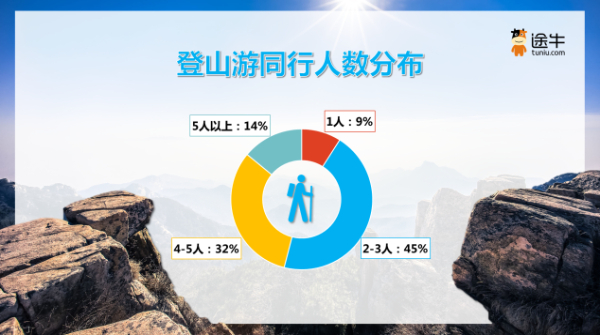 相比其他旅游項目,登山游對用戶的體力和意志力都是較大的挑戰(zhàn),因此,大多數(shù)登山游用戶會選擇多人結(jié)伴同行,以便于登山途中互相鼓勵、互相協(xié)助?!秷蟾妗凤@示,2-3人或4-5人同行是更多登山游用戶的選擇,出游人次占比分別為45%和32%。