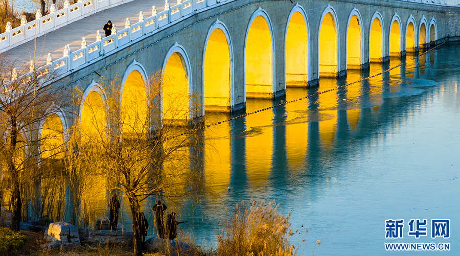 近日,天氣晴好,安徽省淮北市南湖濕地公園的十七孔橋在夕陽的照射下,呈現(xiàn)“金光穿洞”景象,美不勝收。新華網(wǎng)發(fā)(王文 攝)