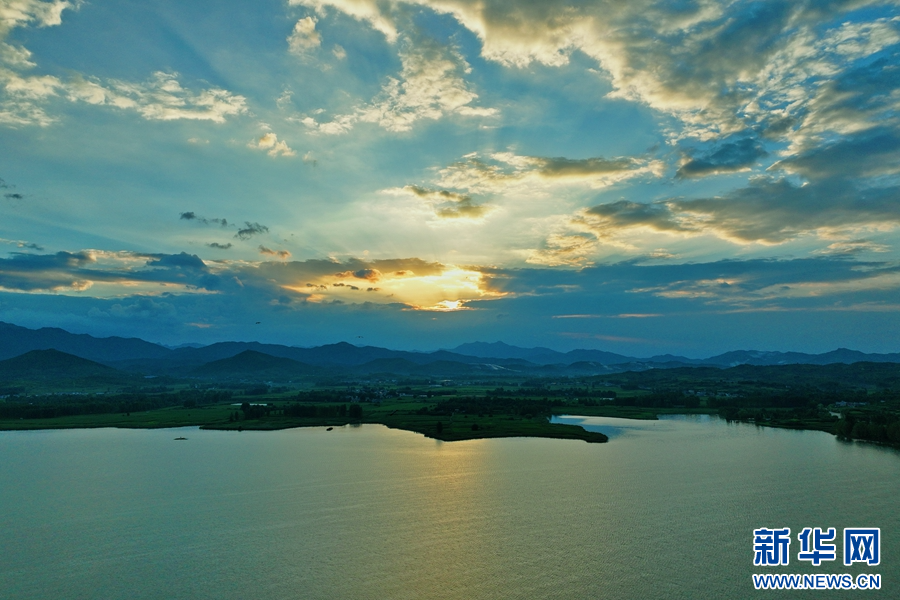 7月27日,河南省南陽市鎮(zhèn)平縣上空朝霞滿天,天空、云朵、群山、水面在霞光的映襯下,宛若一個巨大的調(diào)色盤,美如畫卷。新華網(wǎng)發(fā)(圖文/時君洋)