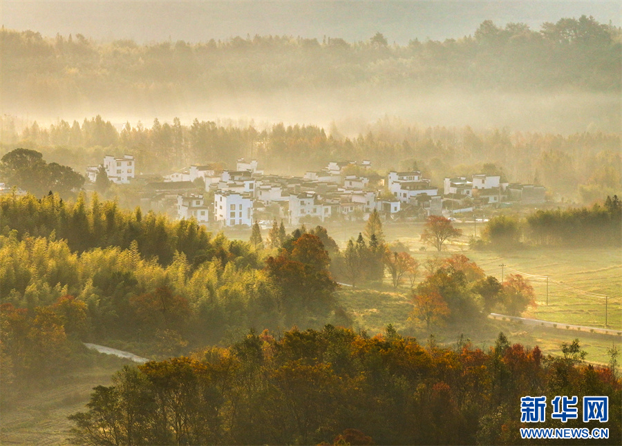 初冬的早晨,安徽省黃山市黟縣盧村云霧繚繞,色彩斑斕的烏桕樹葉與鱗次櫛比的徽派民居交相輝映,景色旖旎,令人流連忘返。新華網(wǎng)發(fā)(施亞磊 攝)