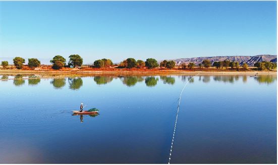 11月29日,萬(wàn)榮縣汾河灘,漁民劃著小船在魚塘里布網(wǎng)勞作。一人一舟,一山一水,呈現(xiàn)出一幅人與自然和諧共生的美麗畫卷。