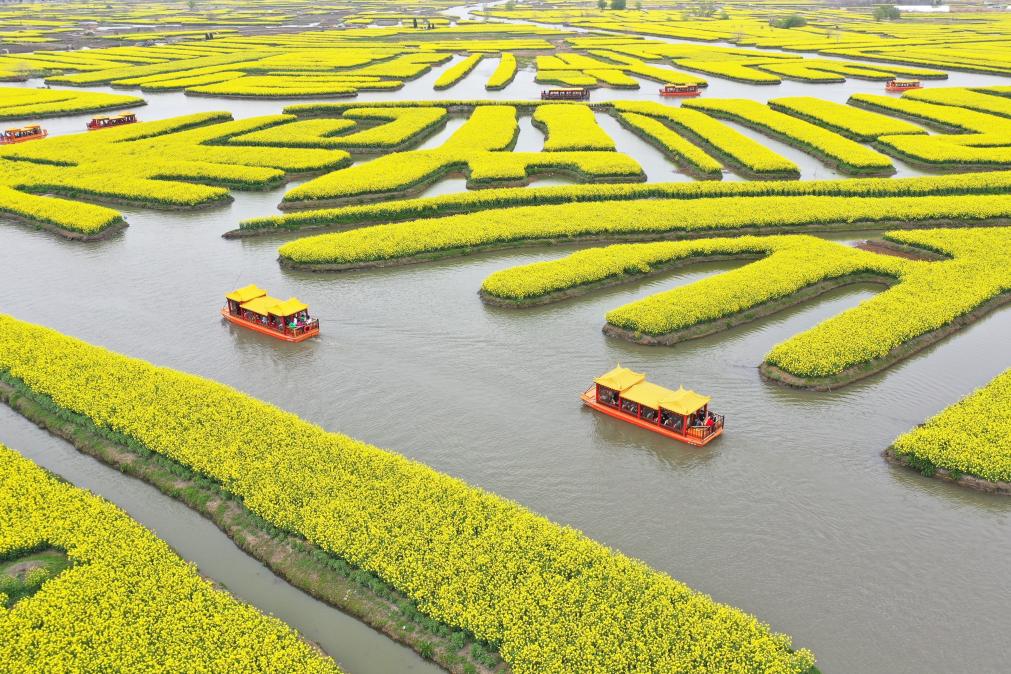 ??2023年3月29日,游客乘坐畫舫欣賞千垛菜花風(fēng)景區(qū)兩岸油菜花(無人機(jī)照片)。新華社記者 毛俊 攝