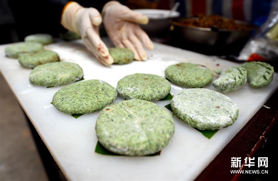 4月2日,黃山市徽州區(qū)西溪南村村民在制作清明粿。清明將至,安徽省黃山市徽州區(qū)的農(nóng)家忙著制作清明粿。清明粿是當(dāng)?shù)厍迕鲿r節(jié)的特色小吃,將新鮮艾草汁拌入糯米粉,再填入徽州特色風(fēng)味的火腿肉、筍丁、肉絲蘿卜丁等原料做成的餡,捏合成清明粿,蒸熟即可食用。新華社發(fā)(周牧 攝)