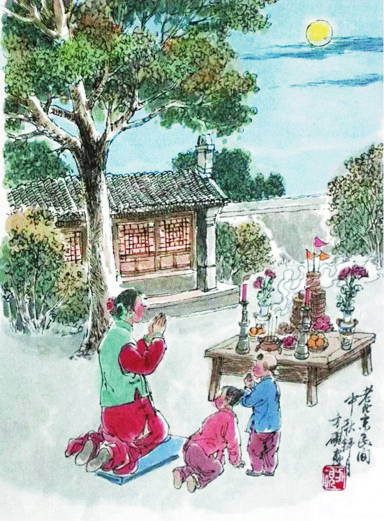 “中秋月。月到中秋偏皎潔?!辟p月是中秋節(jié)的重要習(xí)俗,我國(guó)民間的中秋賞月活動(dòng)約始于魏晉時(shí)期,盛于唐朝,當(dāng)時(shí)許多名篇佳作中都有詠月的詩(shī)句。北宋時(shí)期,以賞月活動(dòng)為中心的中秋節(jié)已成為普遍的民俗節(jié)日,然而與唐代不同的是,宋代關(guān)于賞月的作品多是感物傷懷,以陰晴圓缺喻人情世態(tài)。宋代的中秋夜是不眠之夜,夜市通宵營(yíng)業(yè),游人絡(luò)繹不絕,《東京夢(mèng)華錄》中載:“中秋節(jié)前,諸店皆賣(mài)新酒,貴家結(jié)飾臺(tái)榭,民家爭(zhēng)占酒樓玩月,笙歌遠(yuǎn)聞千里,嬉戲連坐至?xí)?。”一些地方甚至流傳“中秋夜越晚睡越長(zhǎng)壽”的說(shuō)法,于是有了守夜的習(xí)俗。守夜時(shí),家里長(zhǎng)輩通常會(huì)給小孩講關(guān)于月亮的故事,如嫦娥奔月、吳剛伐桂等,孩子們個(gè)個(gè)聽(tīng)得津津有味。