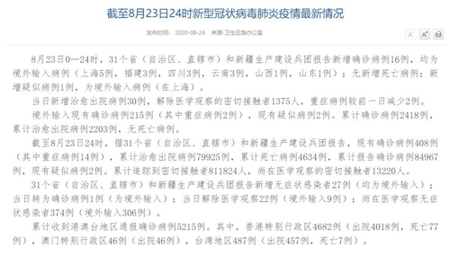 人民網(wǎng)北京8月24日電(董童)國家衛(wèi)生健康委于今日在官網(wǎng)發(fā)布的《截至8月23日24時新型冠狀病毒肺炎疫情最新情況》(以下簡稱“情況”)提出,8月23日0—24時,31個省(自治區(qū)、直轄市)和新疆生產(chǎn)建設(shè)兵團報告新增確診病例16例,均為境外輸入病例(上海5例,福建3例,四川3例,云南3例,山西1例,山東1例);無新增死亡病例;新增疑似病例1例,為境外輸入病例(在上海)。當(dāng)日新增治愈出院病例30例,解除醫(yī)學(xué)觀察的密切接觸者1375人,重癥病例較前一日減少2例。