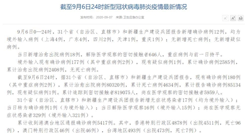 情況顯示,截至9月6日24時,據(jù)31個?。ㄗ灾螀^(qū)、直轄市)和新疆生產(chǎn)建設(shè)兵團報告,現(xiàn)有確診病例180例(其中重癥病例2例),累計治愈出院病例80320例,累計死亡病例4634例,累計報告確診病例85134例,現(xiàn)有疑似病例1例。累計追蹤到密切接觸者819075人,尚在醫(yī)學(xué)觀察的密切接觸者5959人。