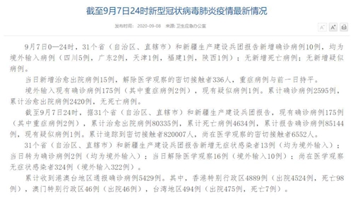 人民網(wǎng)北京9月8日電(董童)國家衛(wèi)生健康委于今日在官網(wǎng)發(fā)布的《截至9月7日24時新型冠狀病毒肺炎疫情最新情況》(以下簡稱“情況)”提出,9月7日0—24時,31個?。ㄗ灾螀^(qū)、直轄市)和新疆生產(chǎn)建設(shè)兵團(tuán)報告新增確診病例10例,均為境外輸入病例(四川5例,廣東2例,天津1例,福建1例,陜西1例);無新增死亡病例;無新增疑似病例。當(dāng)日新增治愈出院病例15例,解除醫(yī)學(xué)觀察的密切接觸者336人,重癥病例與前一日持平。