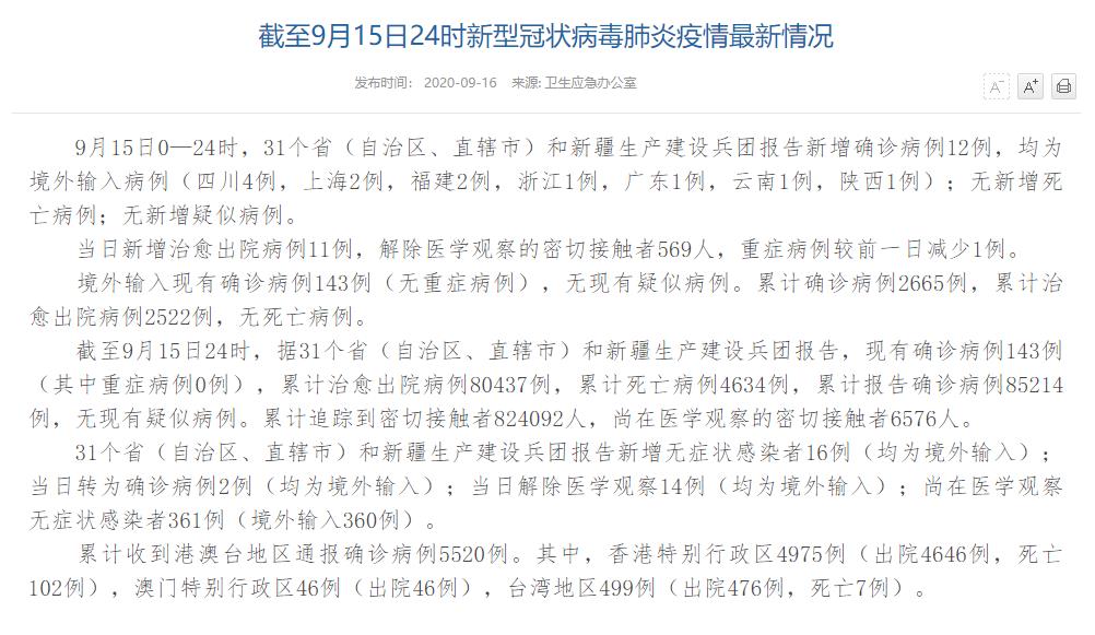 情況顯示,截至9月15日24時(shí),據(jù)31個(gè)省(自治區(qū)、直轄市)和新疆生產(chǎn)建設(shè)兵團(tuán)報(bào)告,現(xiàn)有確診病例143例(其中重癥病例0例),累計(jì)治愈出院病例80437例,累計(jì)死亡病例4634例,累計(jì)報(bào)告確診病例85214例,無現(xiàn)有疑似病例。累計(jì)追蹤到密切接觸者824092人,尚在醫(yī)學(xué)觀察的密切接觸者6576人。