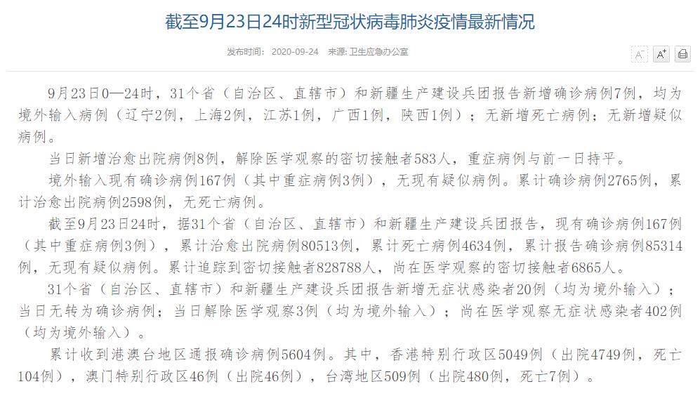 截至9月23日24時,據(jù)31個省(自治區(qū)、直轄市)和新疆生產(chǎn)建設(shè)兵團報告,現(xiàn)有確診病例167例(其中重癥病例3例),累計治愈出院病例80513例,累計死亡病例4634例,累計報告確診病例85314例,無現(xiàn)有疑似病例。累計追蹤到密切接觸者828788人,尚在醫(yī)學觀察的密切接觸者6865人。