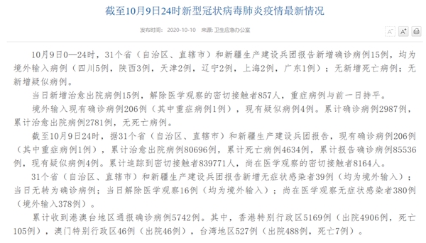 人民網(wǎng)北京10月10日電(許曉華)國(guó)家衛(wèi)生健康委于今日在官網(wǎng)發(fā)布的《截至10月9日24時(shí)新型冠狀病毒肺炎疫情最新情況》(以下簡(jiǎn)稱“情況”)提出,10月9日0—24時(shí),31個(gè)省(自治區(qū)、直轄市)和新疆生產(chǎn)建設(shè)兵團(tuán)報(bào)告新增確診病例15例,均為境外輸入病例(四川5例,陜西3例,天津2例,遼寧2例,上海2例,廣東1例);無(wú)新增死亡病例;無(wú)新增疑似病例。當(dāng)日新增治愈出院病例15例,解除醫(yī)學(xué)觀察的密切接觸者857人,重癥病例與前一日持平。