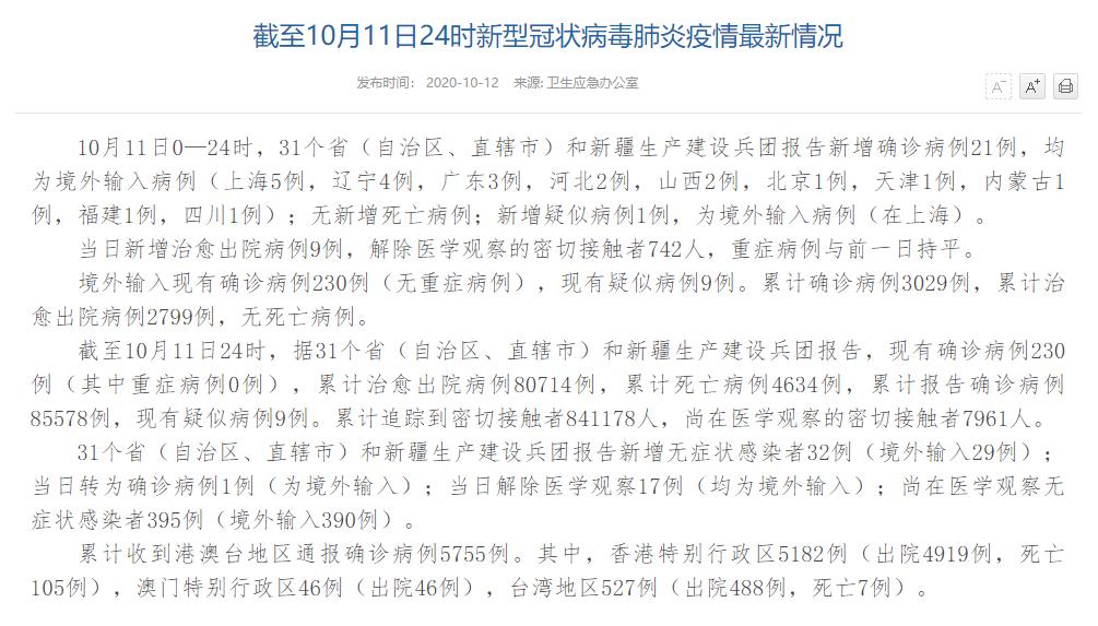 人民網(wǎng)北京10月12日電(董童)國(guó)家衛(wèi)生健康委于今日在官網(wǎng)發(fā)布的《截至10月11日24時(shí)新型冠狀病毒肺炎疫情最新情況》(以下簡(jiǎn)稱“情況”)提出,10月11日0—24時(shí),31個(gè)省(自治區(qū)、直轄市)和新疆生產(chǎn)建設(shè)兵團(tuán)報(bào)告新增確診病例21例,均為境外輸入病例(上海5例,遼寧4例,廣東3例,河北2例,山西2例,北京1例,天津1例,內(nèi)蒙古1例,福建1例,四川1例);無(wú)新增死亡病例;新增疑似病例1例,為境外輸入病例(在上海)。當(dāng)日新增治愈出院病例9例,解除醫(yī)學(xué)觀察的密切接觸者742人,重癥病例與前一日持平。