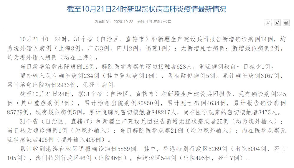 情況顯示,截至10月21日24時,據31個?。ㄗ灾螀^(qū)、直轄市)和新疆生產建設兵團報告,現有確診病例245例(其中重癥病例2例),累計治愈出院病例80850例,累計死亡病例4634例,累計報告確診病例85729例,現有疑似病例5例。累計追蹤到密切接觸者848217人,尚在醫(yī)學觀察的密切接觸者8473人。