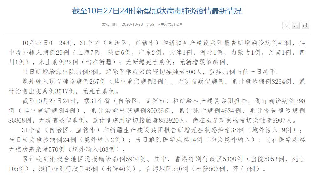 人民網(wǎng)北京10月28日電(董童)國(guó)家衛(wèi)生健康委于今日在官網(wǎng)發(fā)布的《截至10月27日24時(shí)新型冠狀病毒肺炎疫情最新情況》(以下簡(jiǎn)稱“情況”)提出,10月27日0—24時(shí),31個(gè)?。ㄗ灾螀^(qū)、直轄市)和新疆生產(chǎn)建設(shè)兵團(tuán)報(bào)告新增確診病例42例,其中境外輸入病例20例(上海7例,陜西6例,廣東2例,天津1例,河北1例,內(nèi)蒙古1例,河南1例,四川1例),本土病例22例(均在新疆);無新增死亡病例;無新增疑似病例。當(dāng)日新增治愈出院病例8例,解除醫(yī)學(xué)觀察的密切接觸者500人,重癥病例與前一日持平。