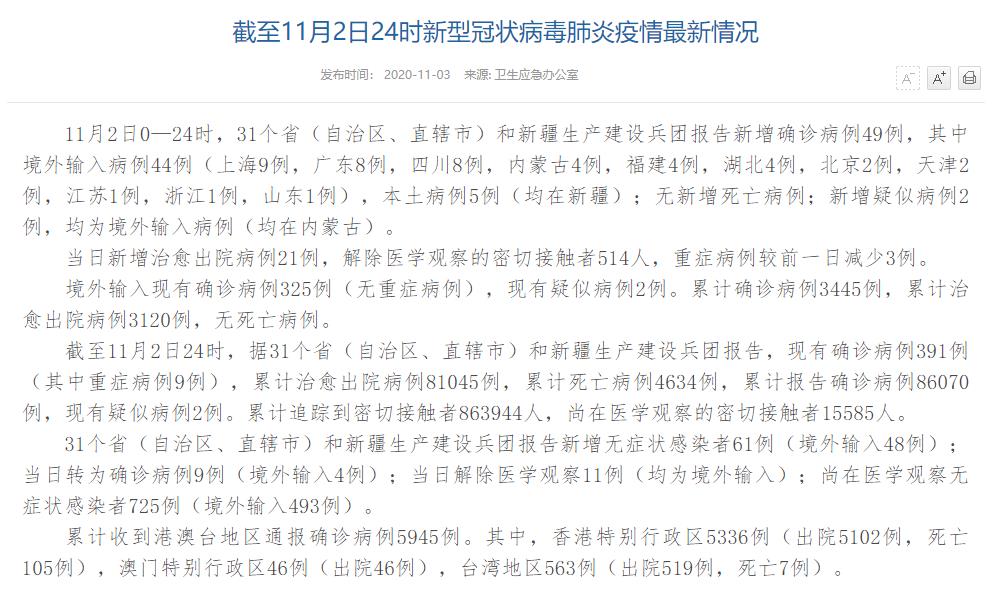 人民網(wǎng)北京11月3日電(董童)國(guó)家衛(wèi)生健康委于今日在官網(wǎng)發(fā)布的《截至11月2日24時(shí)新型冠狀病毒肺炎疫情最新情況》(以下簡(jiǎn)稱“情況”)指出,11月2日0—24時(shí),31個(gè)?。ㄗ灾螀^(qū)、直轄市)和新疆生產(chǎn)建設(shè)兵團(tuán)報(bào)告新增確診病例49例,其中境外輸入病例44例(上海9例,廣東8例,四川8例,內(nèi)蒙古4例,福建4例,湖北4例,北京2例,天津2例,江蘇1例,浙江1例,山東1例),本土病例5例(均在新疆);無(wú)新增死亡病例;新增疑似病例2例,均為境外輸入病例(均在內(nèi)蒙古)。當(dāng)日新增治愈出院病例21例,解除醫(yī)學(xué)觀察的密切接觸者514人,重癥病例較前一日減少3例。