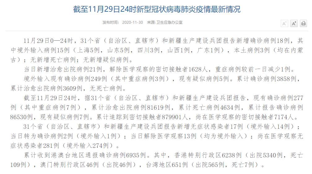 人民網(wǎng)北京11月30日電(董童)國(guó)家衛(wèi)生健康委于今日在官網(wǎng)發(fā)布的《截至11月29日24時(shí)新型冠狀病毒肺炎疫情最新情況》(以下簡(jiǎn)稱(chēng)“情況”)指出,11月29日0—24時(shí),31個(gè)?。ㄗ灾螀^(qū)、直轄市)和新疆生產(chǎn)建設(shè)兵團(tuán)報(bào)告新增確診病例18例,其中境外輸入病例15例(上海5例,山東5例,四川3例,山西1例,廣東1例),本土病例3例(均在內(nèi)蒙古);無(wú)新增死亡病例;無(wú)新增疑似病例。當(dāng)日新增治愈出院病例21例,解除醫(yī)學(xué)觀察的密切接觸者1628人,重癥病例較前一日減少1例。