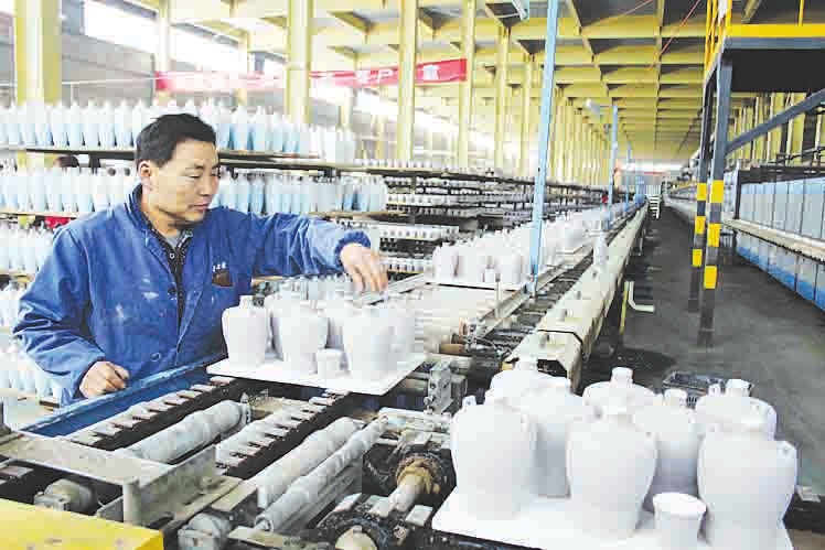 4月7日,位于陽(yáng)城縣町店鎮(zhèn)五龍溝陶瓷工業(yè)園區(qū)的晉城市晉陶陶瓷公司工人正在加緊生產(chǎn)汾酒酒瓶。今年一季度,該公司生產(chǎn)各類(lèi)酒瓶酒具200萬(wàn)支,再創(chuàng)歷史同期最高水平。尹春雷 攝