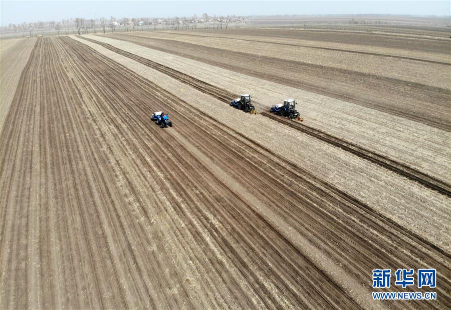 4月23日無(wú)人機(jī)拍攝的吉林省榆樹(shù)市弓棚鎮(zhèn)農(nóng)民在進(jìn)行春耕生產(chǎn)。新華社記者 林宏 攝