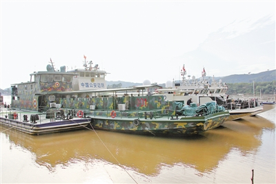 在湄公河“金三角”水域巡邏的中老緬泰湄公河聯(lián)合巡邏執(zhí)法編隊。本報記者 孫廣勇攝