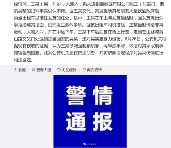 經(jīng)訊問(wèn),王某(男,31歲,大連人,系大連銀燕數(shù)據(jù)有限公司員工)對(duì)毆打、猥褻吳某的犯罪事實(shí)供認(rèn)不諱。據(jù)王某交代,案發(fā)當(dāng)晚其與朋友大量飲酒散席后,乘坐出租車(chē)欲前往女友的住處。途中,王某在車(chē)上與女友通話時(shí),因女友提出分手拒絕與其見(jiàn)面,進(jìn)而發(fā)生激烈爭(zhēng)吵。據(jù)該出租車(chē)司機(jī)描述,王某當(dāng)時(shí)情緒非常激動(dòng),大喊大叫,并在中途下車(chē)。王某下車(chē)后獨(dú)自在街上行走,走到蒼山路與黃山路交叉口處遇到獨(dú)自回家的吳某,遂對(duì)吳實(shí)施暴力侵害。6月26日,公安機(jī)關(guān)根據(jù)現(xiàn)有獲取的證據(jù),認(rèn)為王某涉嫌強(qiáng)制猥褻罪、尋釁滋事罪,依法對(duì)其采取刑事拘留強(qiáng)制措施。此案公安機(jī)關(guān)正在依法偵辦,并將依照法定程序?qū)悄硞檫M(jìn)行司法鑒定。