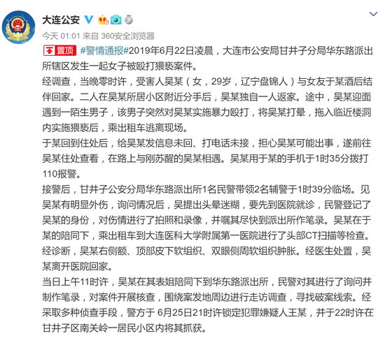6月27日凌晨1時(shí)1分,據(jù)大連市公安局官方微博消息:2019年6月22日凌晨,大連市公安局甘井子分局華東路派出所轄區(qū)發(fā)生一起女子被毆打猥褻案件。