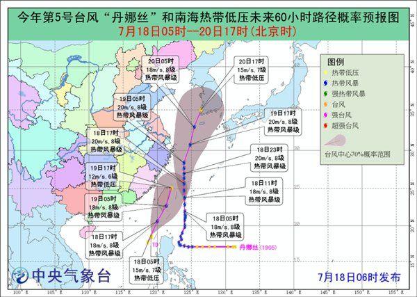 今年第5號(hào)臺(tái)風(fēng)“丹娜絲”(熱帶風(fēng)暴級(jí))的中心今天(18日)早晨5點(diǎn)鐘位于臺(tái)灣島臺(tái)東市東偏南方大約305公里的西北太平洋洋面上,就是北緯22.0度、東經(jīng)124.0度,中心附近最大風(fēng)力有8級(jí)(18米/秒),中心最低氣壓為994百帕,七級(jí)風(fēng)圈半徑200-300公里。