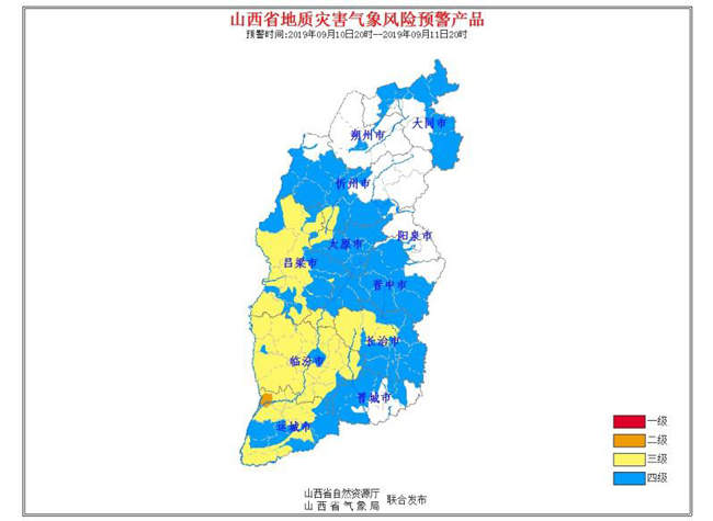 9月10日17時23分,山西省自然資源廳和山西省氣象局聯(lián)合發(fā)布地質(zhì)災害氣象風險預警: