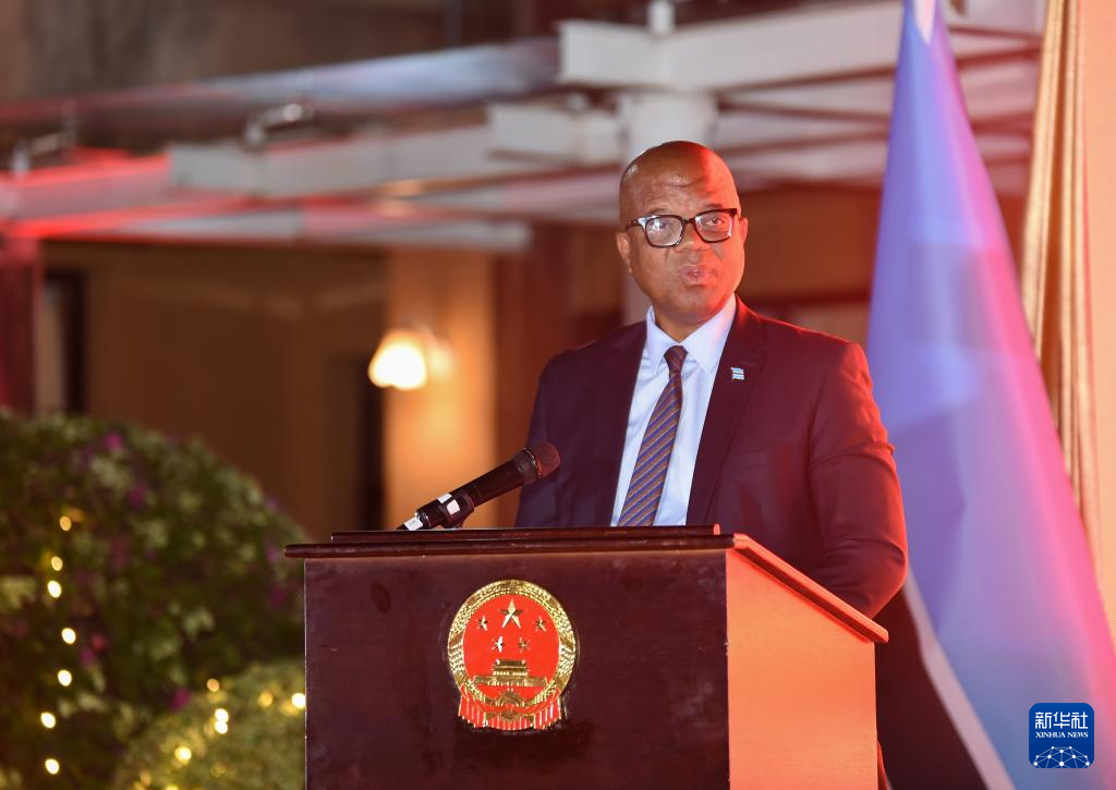9月25日,在博茨瓦納首都哈博羅內(nèi),博茨瓦納總統(tǒng)事務(wù)部長(zhǎng)莫瓦薩在慶祝中華人民共和國(guó)成立76周年招待會(huì)上講話。新華社發(fā)(策基索·特巴洛攝)