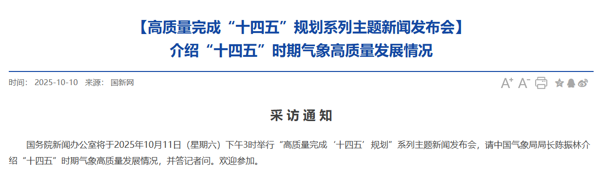 ??今日下午3時(shí) 國(guó)務(wù)院新聞辦公室將于2025年10月11日(星期六)下午3時(shí)舉行“高質(zhì)量完成‘十四五’規(guī)劃”系列主題新聞發(fā)布會(huì),請(qǐng)中國(guó)氣象局局長(zhǎng)陳振林介紹“十四五”時(shí)期氣象高質(zhì)量發(fā)展情況,并答記者問(wèn)。