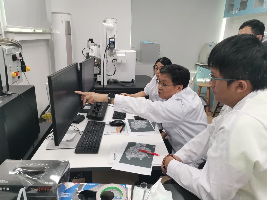 2024年8月26日,徐義剛院士與團(tuán)隊(duì)成員通過(guò)掃描電鏡觀察嫦娥六號(hào)樣品特征。(中國(guó)科學(xué)院廣州地球化學(xué)研究所供圖)