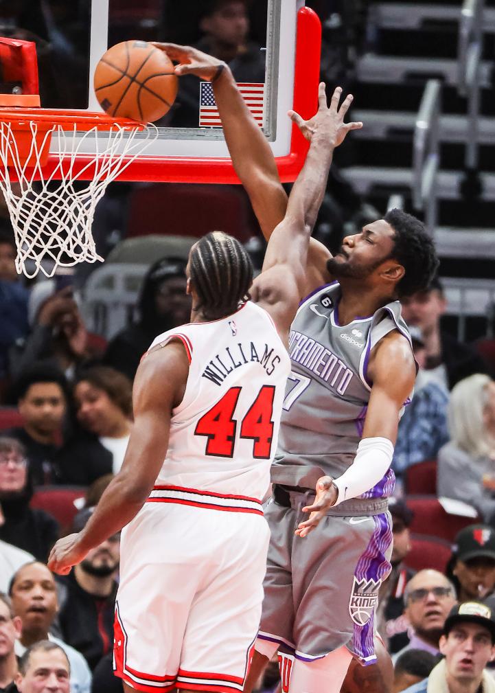 3月15日,效力于薩克拉門托國王隊(duì)的愛德華茲(右)在比賽中扣籃。當(dāng)日,在2022-2023賽季NBA常規(guī)賽中,薩克拉門托國王隊(duì)客場以117:114戰(zhàn)勝芝加哥公牛隊(duì)。新華社發(fā)(喬爾·萊納攝)