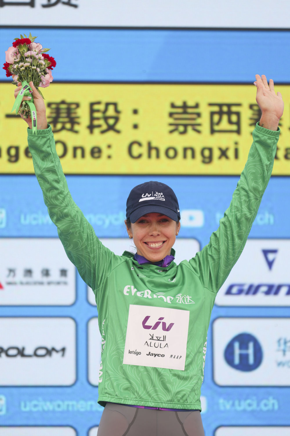 10月14日,麗芙-埃爾奧拉-杰科車隊(duì)澳大利亞車手貝克身著代表沖刺總積分第一名的綠衫在頒獎(jiǎng)儀式上慶祝。新華社記者 王翔 攝