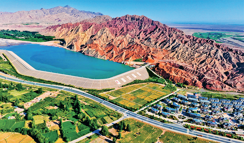 黨的十八大以來(lái),經(jīng)過(guò)頑強(qiáng)努力,我國(guó)天更藍(lán)、地更綠、水更清,萬(wàn)里河山更加多姿多彩。圖為2023年6月15日,甘肅省張掖市臨澤縣的紅山灣水庫(kù)與丹霞美景構(gòu)成一幅“戈壁水鄉(xiāng)”生態(tài)和諧絢麗多彩的畫(huà)卷。人民圖片 王將/攝